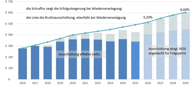 In der Grafik sieht man die bisherige Nettoausschüttung des obigen Beispiels bei einer Veranlagung von EUR 10.000.-. In hellem Blau sind die geschätzten Zahlungen angeführt. Bitte beachte den schraffierten Bereich, der ab 2017 die Balken überragt. Dieser stellt die Auswirkung der Wiederveranlagung der Dividende dar. Anfangs noch unscheinbar, wird er über die Jahre immer signifikanter. Deshalb empfiehlt sich eine Reinvestition der Ausschüttungen. Erst nach Erreichung des Anlageziels ist es zielführend, sich die diese auszahlen zu lassen, um beispielsweise davon zu leben.